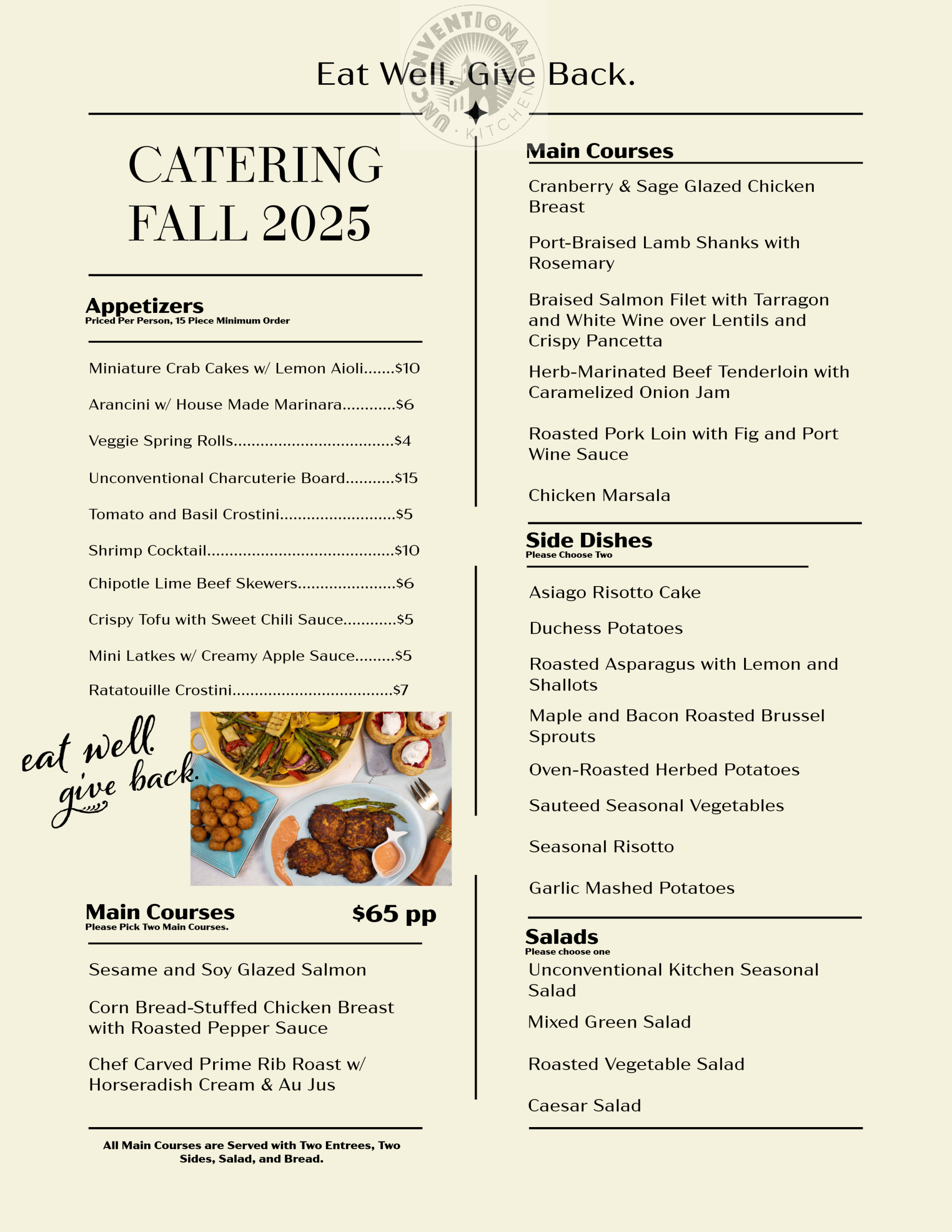 Catering is now available from The Unconventional Kitchen. We serve groups of ten or more with flexible options, fresh flavors, and signature creations. Every meal not only tastes great but also supports our mission.